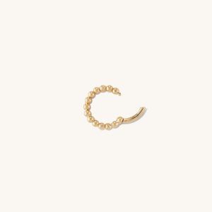 One of our lightest hoops now designed to wear on your helix, with a hinge clasp that makes it easy to put on and wear. Handcrafted in 14k solid gold with a hollow pattern of spheres. Sold individually.