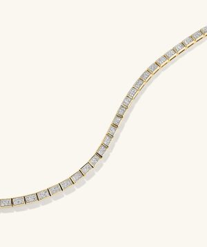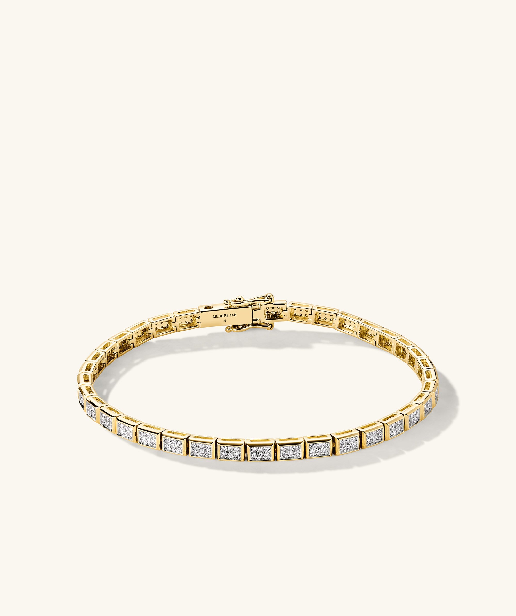 There’s nothing like capturing that ping of sparkle from diamond. Here’s that ping multiplied for an investment piece that’ll induce gasps for decades to come. Handcrafted in 14k solid gold featuring responsibly sourced diamonds. To put on the bracelet, insert the tongue into the clasp until you hear a “click.” Then, clip the safety arms down on both sides of the clasp to secure the bracelet. To take it off, unclip and pull the two horizontal safety arms away from the sides of the clasp. Then, press the thin vertical button to release the inner tongue.